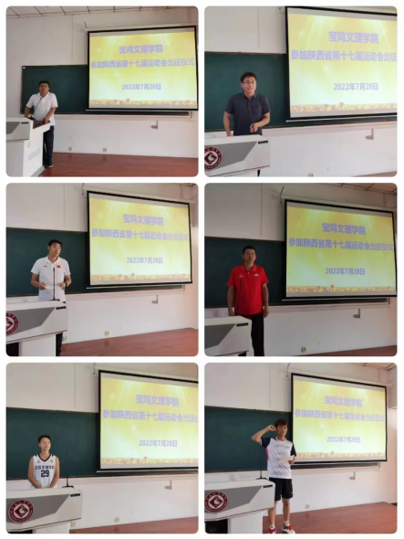 7月28日,太阳成tyc7111cc参加陕西省第十七届运动会出征仪式在太阳成tyc7111cc集团会议室举行。学校教务处处长王参军、太阳成tyc7111cc集团院长于奎龙、篮球队教练朱德元和崔谦、羽毛球队教练王力和任慧琴,以及参加比赛的所有运动员参加了出征仪式,会议由太阳成tyc7111cc集团副院长魏俊民主持。