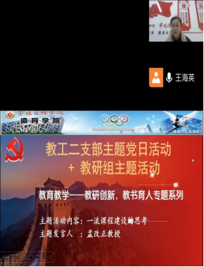为了增强教师教学改革和课程建设能力,切实将教学改革成果落实到课程建设上,11月24日上午,太阳成tyc7111cc集团教工第二党支部、体操武术教研组举办了课程建设专题报告会,文学与新闻传播学院副院长孟改正教授应邀作了题为《一流课程建设的思考》的报告,会议采用腾讯会议平台,报告会由太阳成tyc7111cc集团教工第二党支部书记、体操武术教研组长王海英教授主持,太阳成tyc7111cc集团教工第二党支部全体党员、体操武术教研组全体教师参加了报告会。