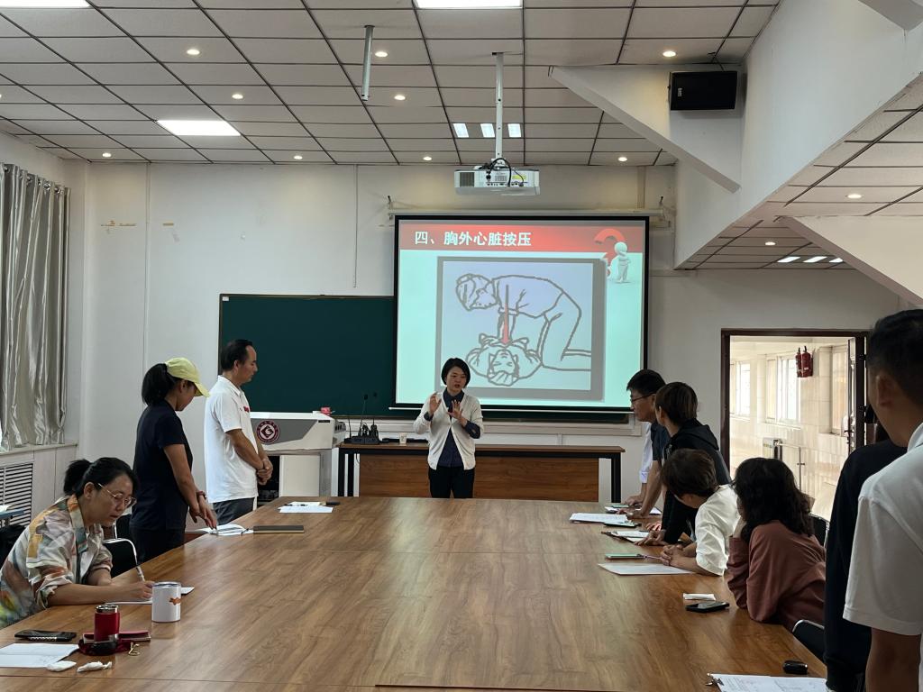 李卫华以体育赛场发生的猝死事件为例,强调实施抢救措施的重要性和必要性,首先分析心脏骤停的原因,强调4分钟是救命的“黄金时刻”,阐述心肺复苏的要点和注意的问题,着重讲授心肺复苏程序C-A-B,即:C胸外按压→A开放气道→B人工呼吸。从判断意识、启动急救系统、检查大动脉搏动、胸外心脏按压、开放气道、人工呼吸等方面进行讲授。其次,现场指导大家学习胸外心脏按压方法,并与参会教师进行了交流。