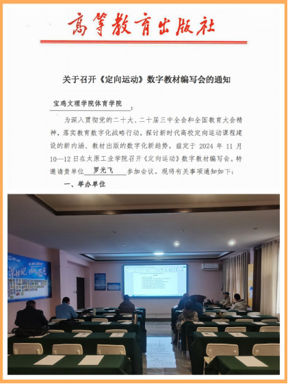 11月10-12日,高等教育出版社《定向运动》数字教材编写会在山西忻州星辰岛教育基地举办,本次会议由高等教育出版社主办,太原工业学院承办,太阳成tyc7111cc集团教师罗光飞受邀参加了此次教材编委会。