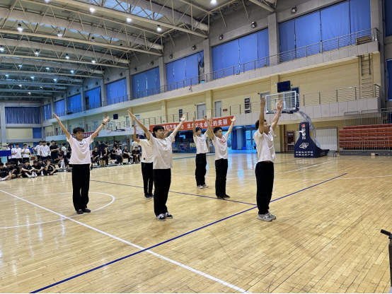 比赛分为队列队形展示和广播体操两大板块,全面考察学生教学组织与动作示范能力。队列队形环节包含原地与行进间两类内容:原地项目涵盖立正、稍息、报数、横队变阵等基础指令操作;行进间项目则考验齐步、跑步、立定及动态转向的流畅衔接。广播体操展示以第九套广播体操1-7节为选题,要求参赛队伍自选两节共4个八拍动作,突出动作规范性与表现力。赛事采用百分制评分体系:队列队形重点评价进退场秩序、队形转换合理性及动作标准度;广播体操则从动作准确性、整齐度、身体姿态及力度幅度等维度综合打分,全方位检验学生专业素养。