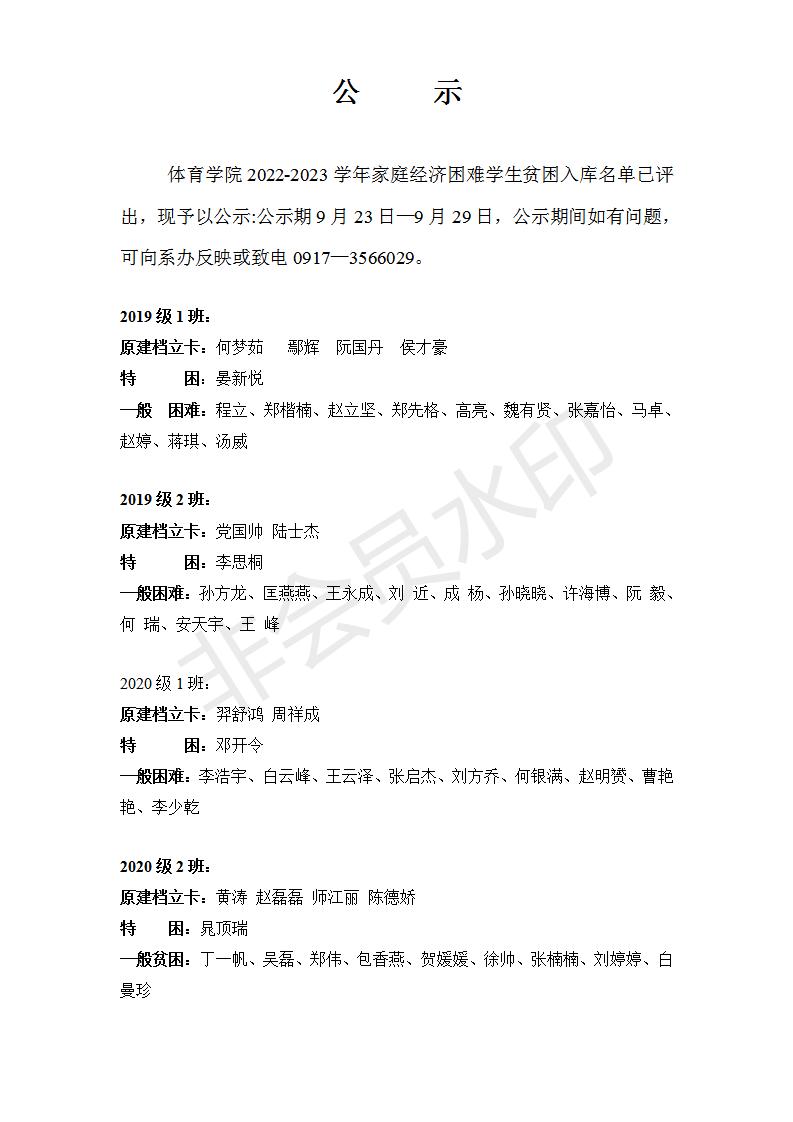 太阳成tyc7111cc集团2022-2023学年家庭经济困难学生贫困入库名单已评出,现予以公示:公示期9月23日—9月29日,公示期间如有问题,可向系办反映或致电0917—3566029。