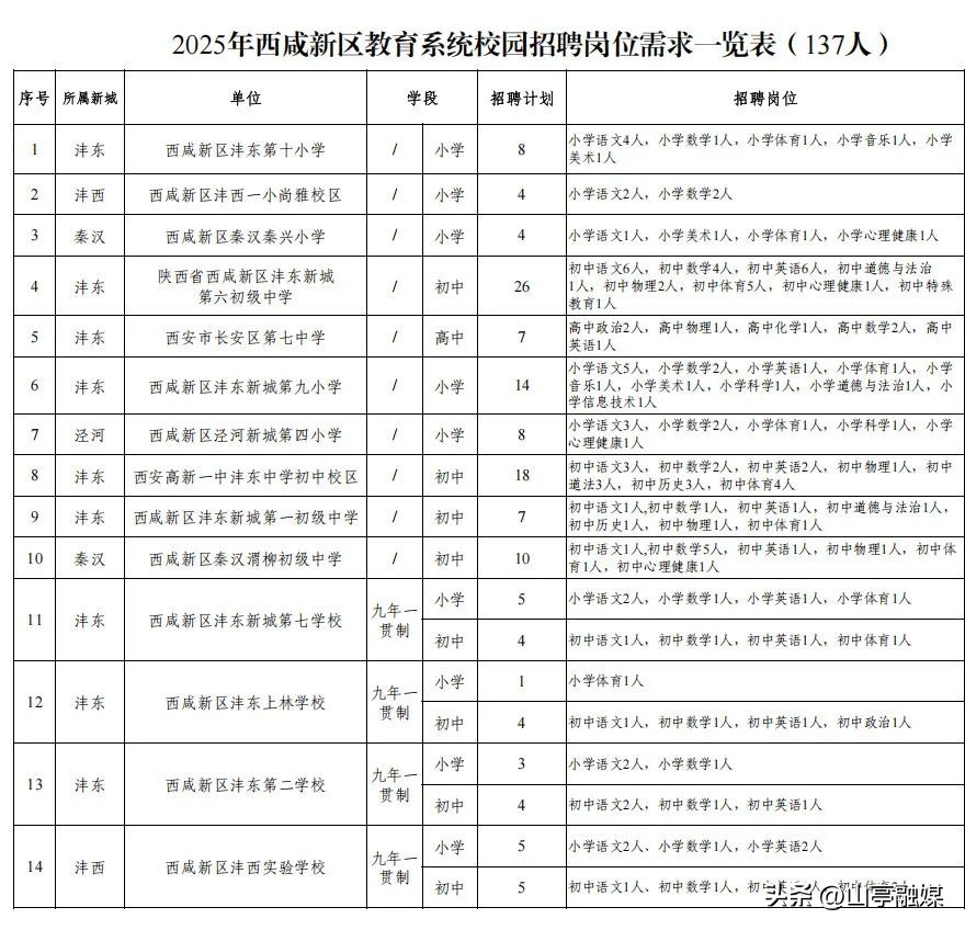 计划为西咸新区14所公办中小学校招聘教师137人,具体岗位及人数见《2025年西咸新区教育系统校园招聘岗位需求一览表》。